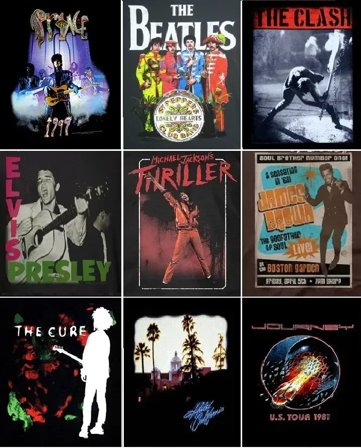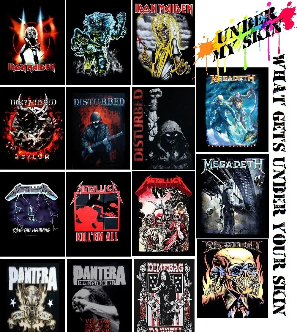 The shirt designs change out on a regular basis. But you will always find classic designs like the Gun's & Roses "Appetite For Destruction Cross", Pink Floyd's "Dark Side of the Moon", The Misfits "Fiend Skull", and A LOT MORE! Plus, vintage & rare designs, as well as classic concert tees, and MORE!